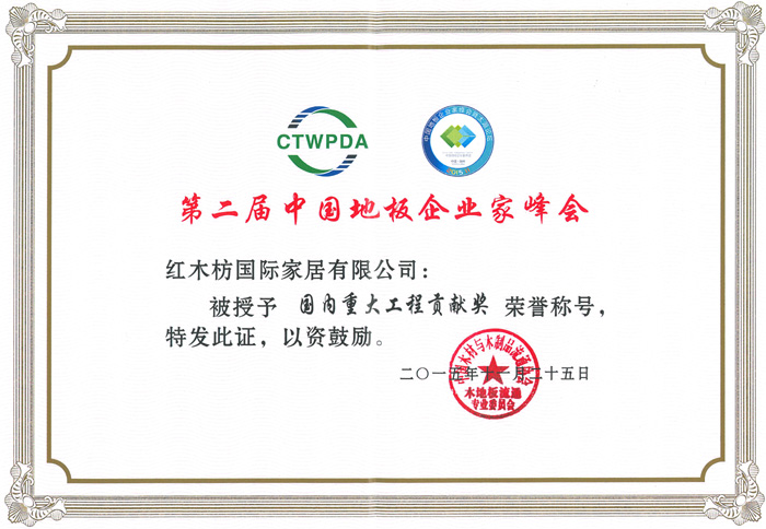 2015年11月25日,由中國(guó)木材與木制品流程協(xié)會(huì)主辦,主題為“審時(shí)度勢(shì)和衷共濟(jì)”第二屆中國(guó)地板企業(yè)家峰會(huì)在浙江湖州開(kāi)元名都大酒店隆重召開(kāi)。來(lái)自全國(guó)各地200余家優(yōu)秀企業(yè)家及業(yè)界專(zhuān)家代表出席本次會(huì)議。紅木枋地板作為行業(yè)新秀應(yīng)邀參加本次高峰會(huì)議。并獲得“中國(guó)地板行業(yè)科技創(chuàng)新獎(jiǎng)”和“國(guó)內(nèi)重大工程貢獻(xiàn)獎(jiǎng)”兩項(xiàng)殊榮。這是行業(yè)對(duì)紅木枋地板的最高禮遇,也是激勵(lì)紅木枋地板實(shí)現(xiàn)夢(mèng)想,不斷前進(jìn)的利器。